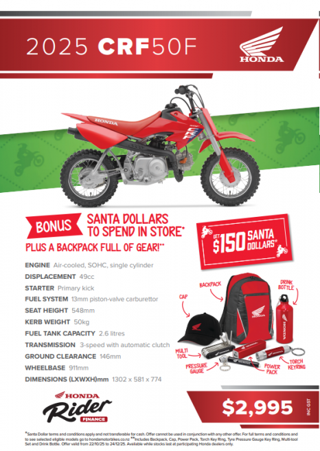 Little legs can reach the ground thanks to the CRF50F’s super-low 548mm seat-height, allowing even the smallest of riders to discover the thrills of off-road riding, and superior suspension, powerfully responsive brakes and wide tyres all work to keep small riders safe and comfortable. Give your kids a flying start with the CRF50F - you’ll be surprised where it can take them!